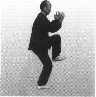 重心移到左腿,右脚提起,由右向左摆到左膝前,摆脚时脚心向前, 定势时脚心斜向下;同时,右手上提至胸前,左勾手变掌,手心向下、向 后、向上经头前划圈落至胸前,与右手相交成十字手,左手在内,手心向 右,右手在外,手心向左。眼 向东北平视(图37)。