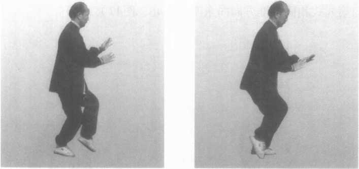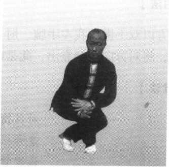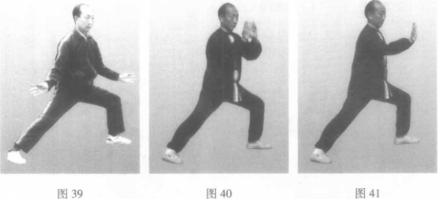 图38图38右脚从左脚尖前落下变实, 脚尖向东南,交叉手向右膝外 下落,其余动作与第九式相同 (图38、图39、图40、图41)。
