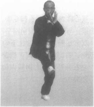 重心移到左脚,坐左腿,右脚原地变虚;同时,左手外旋,手心向 上、向左前、向上划圈至头顶,内旋转手心向上撑掌;右掌变拳外旋,拳 心向上,右前臂内收,肘尖贴住右肋,形成大于90。的角,右拳在右膝上 方。眼向西平视(图54)。