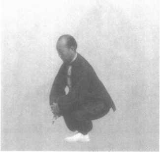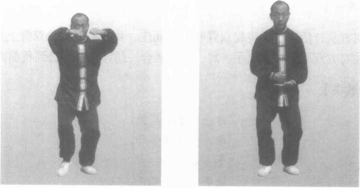 右脚踏实,左脚变虚,左 拳变掌,手心向上,置右拳下 约1寸,两手一起下落到腹前; 左掌在脐下,右拳在脐上,左 掌右拳距腹约1寸。眼向南平视 (图51)。用法与第十四式基本 相同。
