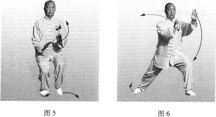 步;同时,双手由下向上、向左前方抻起,左手在前,指尖高与眉齐,与左 脚尖相对齐,肘与左膝相对齐;右手在胸前,高与鼻平;两手掌与前臂成弧 形,不要在手腕处成折。眼、身体依然朝南,眼神要关顾到双手(图6)。