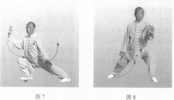 致,指尖高与眉齐,与脚相对齐,肘与膝相对齐;左手弧形下按至左膝上 方,手心向右;眼与身体转向西南方。眼平视,眼神关顾到右手(图7)。