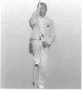 右脚蹬地,提膝向前高与胯 平,脚掌平,脚心正对地面,脚尖 向前,成左独立式;左脚趾抓地, 脚尖向南不变;同时,右手转手心 向左,弧形上提,高与头平,右肘 与右膝相对齐;左手向里经胸前下 落至左胯根前,手心斜向右下。眼 向南平视(图9)。