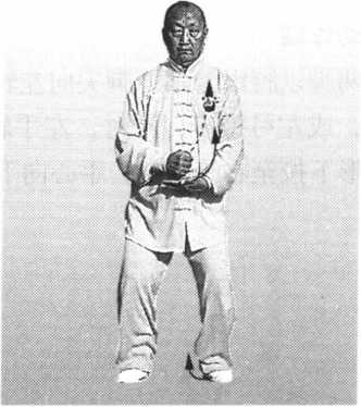 右脚落下,与肩同宽,右脚 实;左脚虚,脚尖点地;同时,左手手心转向上,平置脐下与腹部距离约 1寸;右掌逐渐变拳弧形下落置于左手上方,与左掌心相距约1寸,略高于