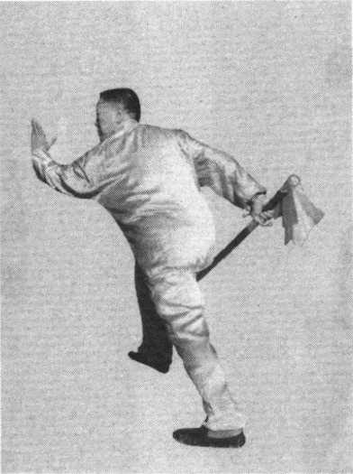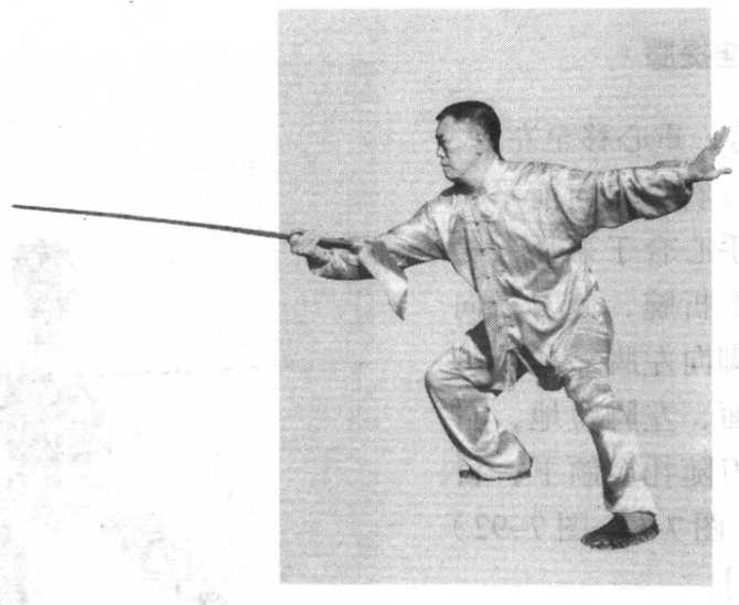 转身下势要扣右脚,使脚尖朝正南。调胯,尾闾找右脚 跟。推刀、展臂、拧腰、合胯要同时进行。