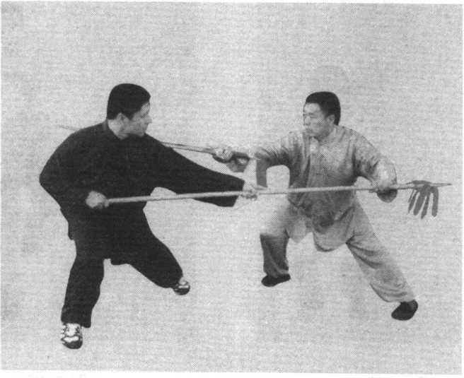 承上势。设敌枪自左前方刺我,我以左手轻掳其枪杆,待 我之刀尖刃接近敌腕时,转身猛掳,长刀截其后背。(图7-89)