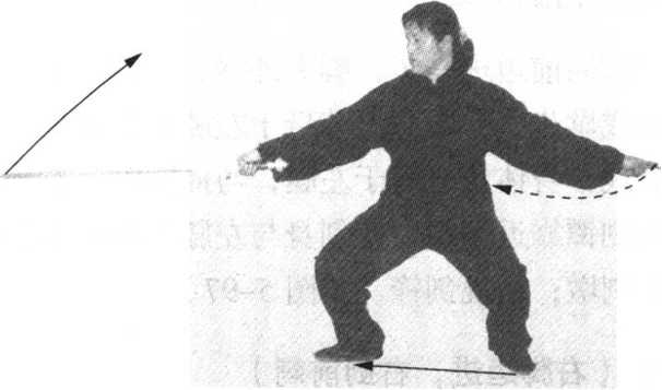 身体起立,右脚越过左脚向前迈进一步,随屈右膝前弓身 体重心落在两腿之间,两腿形成马步;同时,左诀指与右手剑 向前后平分,以催动右手剑借助分力向前平刺,右前臂外旋,