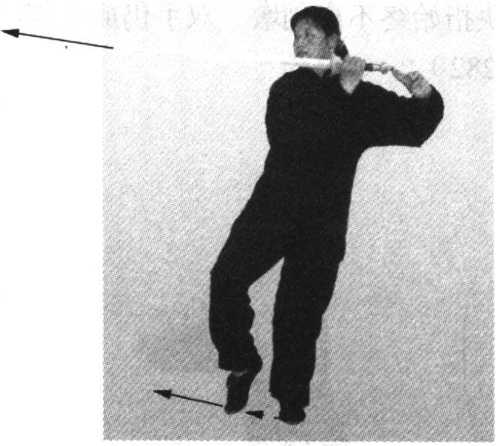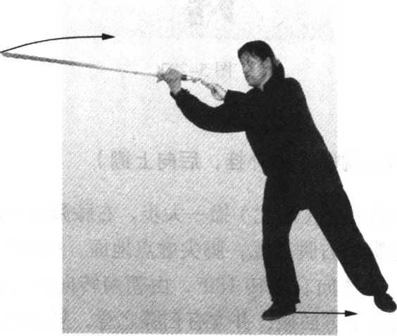 蹬左脚,使右脚向前(正西)跃进一步,左脚随着跟进一 步,身体重心移至右腿,两腿成右弓步;同时,右手剑与左诀