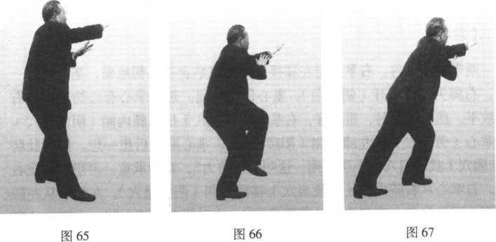 重心后移到左腿,成左坐步;左臂向左前上方(东北隅)舒伸,掌心向 下,指尖向前;右掌拇指贴左臂弯,掌心向下,随动;同时,收回右脚,向 右后(西南隅)撤一步,脚跟着地。眼看左食指尖(图65、图66、图67 )0