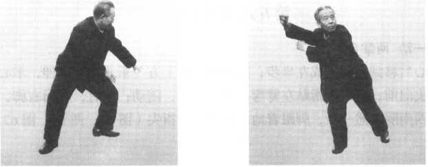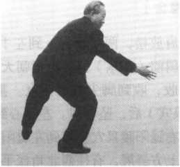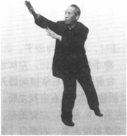 右臂以右食指引导,向右前方舒宜。感到左脚虚了,沉右肘,右臂往左 前方移动。松右肩,屈左膝,重心自然移到左腿。左肩放松,右膝松力,左 肘下沉,右膝上提。左臂通过右臂下面,往左前上方舒伸。松左肩,左掌根 一沉,掌心向前突出,指尖向上。右脚心有反应时,右脚自然向右后方撤一 步,脚跟着地。左掌心、右脚心和命门三点连一线,同时有气感反应。