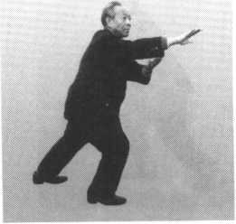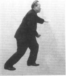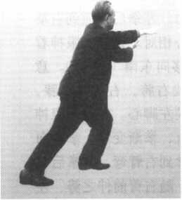 想右肩找左胯,左掌划外弧由左前方向左后捋。同时重心后移成右坐 步。想左肘找右膝,左手找右脚,左掌在正前方向右。松右肩,坠右肘,右 掌变拳,腕骨(尺骨头前)贴腰间(日月穴),稳住重心。尾散骨对右脚跟, 意想右拳坠一吨重的东西。右肘下坠,左掌自然立起,中指对鼻尖。眼神顺 左食指上方平远视。