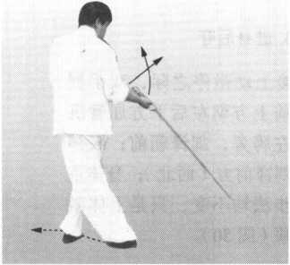 上体微向右转,同时,左脚向西北虚上一步,随后屈膝前拱,右腿在后伸 直成左弓步;重心移于左腿;两手阴阳合把握好剑柄,顺眼神(眼神从左肩上