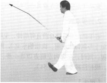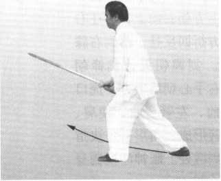 剑与身法均不变(保持上一动招势),右脚向前迈进一步,脚跟虚沾地