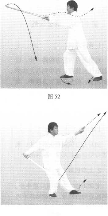 右脚逐渐落平,随之屈膝前 拱,左腿舒直成右弓步;重心移 于右腿;同时,双手握剑,轻轻 向前直臂送出,高与肩平。眼神 仍视前方(图52)。