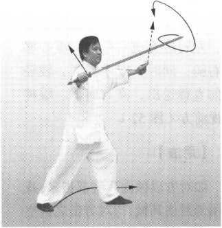 如对方以械朝我头部打来,我先以械迎接其械与之相粘后,随即顺其来 劲往后一带,趁对方身子前倾之际,再挥剑转向前方横斩敌腰。