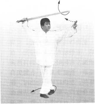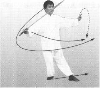 上动不停。右脚朝后撤半步, 上体随着向后仰身,眼神始终不离 剑锋;同时,右手剑与左诀指在头