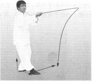 左诀指屈臂回摸右肩、左肩 之后,直臂朝东南方向指出,在 诀指摸左肩同时,右手剑自然向 下坠落,而隐于身后;右脚尖自 然里扣;左诀指朝前指出时,往 后坐身收回左脚,脚尖虚沾地面 成丁虚步;重心寄于右腿。眼神 注视前方(东南)(图53 )。