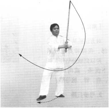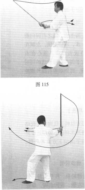 左脚朝前(正东)迈进一步,不停,以脚跟为轴,脚尖里扣,身体随之 向左后方扭转,转成面朝西;同时,右手剑以剑锋引导,走一个立圆形的半 个圈(即由东往下、往后至正西),左诀指始终不离右脉门处;这时,往后 坐身,右膝微屈,重心寄于右腿,左脚微向后撤,脚尖虚沾地面;剑锋由下 向前上方挑起,高与鼻尖相平。两眼向前(正西)平视(图115)。