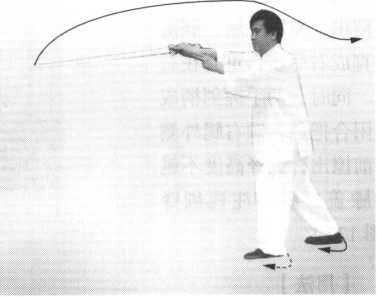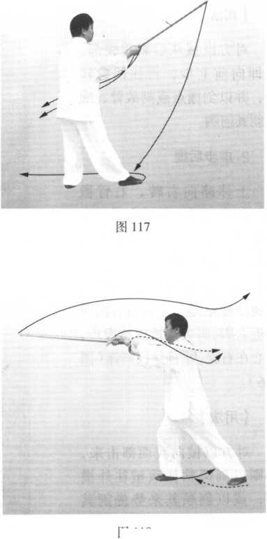 右手剑腕部松力,使剑锋由上向右(正东)降落;落至高与肩平时,左 脚向前(正西)垫上半步,落实,重心移至左腿;同时,左诀指扶在剑墩 ±o眼神注视剑锋(图117)。