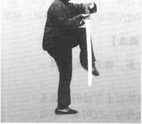 紧接上动。长身提右膝成左独立式;右手刀反腕垂直上提至刀盘与肩