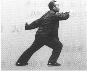 接上动。屈左膝,上右步成 右弓步式;同时,左掌经体前向 身体左后方掳出,在身后成钩手, 右手刀经脑后裹至左肩后,置于 左上臂上。变脸后向东北方向看 (图 75 )。