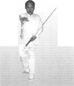 承上动。当我向前劈刀时,身后有敌枪刺我,我即回身以刀圈拦其枪, 使其刺向体外。