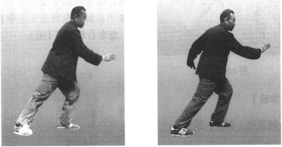 右掌以食指引导向右前斜上方(东南)伸出,到右膝前,右掌在左掌之 前上方;同时收左脚,向前伸出成正步;继续以右掌向左后下方捋至左膝 前,左掌往后移到左胯外侧;弓左膝成左弓步;重心在左脚,视线随右掌食 指尖;意在右掌掌心(图125、图126 )0
