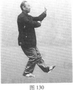 左脚不动,坐身成右坐步;左 掌渐变为拳,掌心翻而向上,由左 肋下向右斜上,经过右臂弯向前上 方伸出,以食指中节对正鼻尖为止, 掌心向内;同时,右掌变拳,向下 松撤,以拳眼贴于左肘下为度;重 心集于右脚,视线注于左拳食指中 节;意在右拳(图130 )0