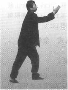 两拳同时松开变掌,掌心互相翻转向左前方移动,右掌伸到左肘下,掌 心向下,虎口朝后;左掌心向上,虎口朝前,左脚落平,弓左膝成左弓步; 重心移至左脚,视线注于右掌食指尖;意在左掌掌心(图132)。