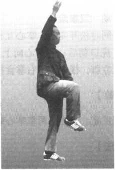 此式是以一■条腿支持体重, 而另一腿屈膝提起垂悬不落,形 如鸡之单腿独立状态,故取此 名。