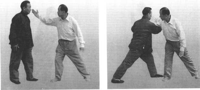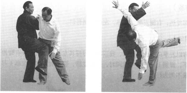 对方以右掌向我面部打来,我以 左手刁捋其右腕,同时以右臂粘住其 右臂外侧向上挑伸。与此同时,提起 右膝,撞击对方之下腹部。练习此法 要慎重,最好知之而不用为妙(图 136、图 137、图 138、图 139 )0
