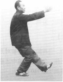 重心不动;右掌以食指尖引导,渐向前上方移动,以臂与肩平为度,掌 心向左;左掌由右耳侧移至右臂下,以掌心顺右臂向前伸长;同时,右掌掌
