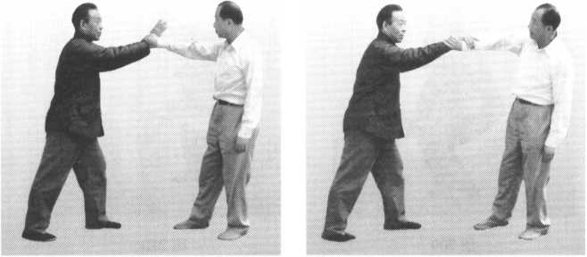 我之右手腕被对方捋拽时,我 即随其拽劲,将右臂和腕部放松, 并以手指指尖向前舒伸。同时上体 微微后倚,尾戢骨对正右足跟向下 坐身,这时对方反被我拽起(图 206、图 207、图 208 )。
