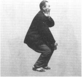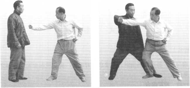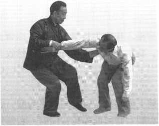 接上动。当我的右手腕被对方以右手拽住时,我即将右手腕放松,使手 指尖向下引伸,含有插入地中之意。同时屈膝略蹲,并以左掌往前伸出点刺 敌之肋下神经(图210)。