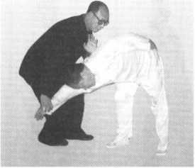 图213图213图214图214如对方以右拳向我前胸打来,我则以右掌粘其右肘外侧,向上擎起,高 过头顶。同时,上身微微向右一转,左脚向前迈进一步,使左大腿贴近对方 的右大腿,这时,对方已被我拿起来(图213、图214)。