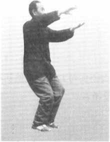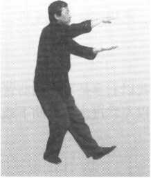 松腰,右掌腕部松力,指尖 渐向两膝间下指,掌心向左,指 尖向下;左掌以食指引导斜右上, 食指尖到右耳外侧为度,掌心向 右,指尖向上;同时左膝松力, 左脚撤到右脚外侧,脚尖虚着地; 重心仍在右脚,视线向正前平远