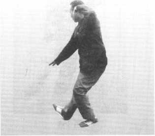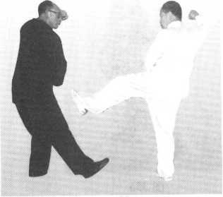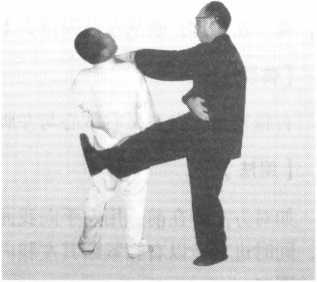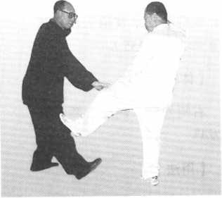 以右脚向我下腹部同时进攻,我则以右手粘其左手腕部上提,同时以左手按 其右膝,使对方的进招失去重心和使之进攻失去效用(图356、图357)。