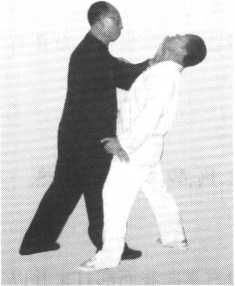 如对方左脚在前,用左手向我面部打来,我即用右手沉采对方的左肘内 侧,同时进右步以右膝紧贴其左膝内侧。与此同时发左掌击其面部或腋下神 经(图354 )。