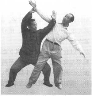 接上动。当对方身体失去重心不稳之际,我顺其倾斜方向下捋之,左掌 返回向上,向左沿其臂内侧反击其面,或用左臂沿其左臂外侧,左掌随进随
