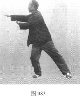 左腕松力,左掌以食指引导, 向右下方移动,掌心向右,经左 膝,走下弧形而到右膝,重心渐渐 移于右脚;右钩变掌,以食指引 导,向右方伸出,掌心向下;重心 集于右脚;视线注于右掌食指尖; 意在右掌掌心(图383 )。