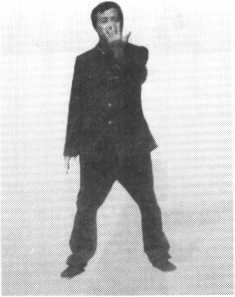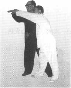如对方以左掌打我面部,我则以右掌粘其左腕,并以左掌向右脚跟的右 后方往下一捋,使对方的重心失去平衡,站立不稳(图384、图385)。