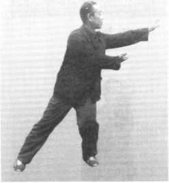 左掌小指外转,掌心渐渐向外,到左前方时,重心移于左脚;左掌转到左方 (正东)时,掌心向下平按,高与肩平;同时,右掌走下弧形,经右膝到左 膝,重心集于左脚;视线注于左掌食指尖;意在左掌掌心(图386、图387)。