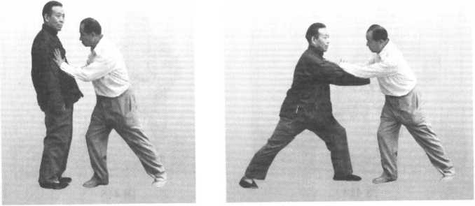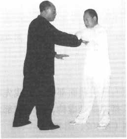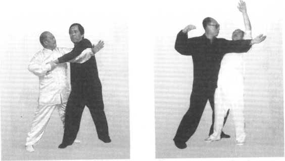 接上动。我再用右手刁住对方右手腕,同时,上体下蹲成马步,并以左 掌沿对方的左臂外侧向上、向左平按,至左掌掌心贴近对方右肩为度。这时 对方便会应手而跌出很远(图405、图406、图407)。