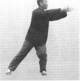 右钩变掌,掌心向下,以食指引导向下 走下弧形,经右膝、左膝,再上行到腕与肩 平,同时左掌面向左前伸出,以两掌相齐为 度,左掌掌心向右,右掌掌心向左,两掌相 对,指尖均向前;两掌距离与肩同宽;重心 移于左脚;眼向左前(正东)平远看;意在 右掌掌心(图408、图409)。