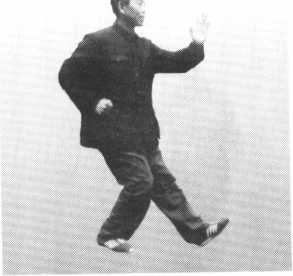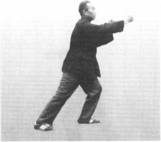 右拳渐向正向前方伸出,伸到左掌掌心右侧,左脚落平成左弓步时,右 拳继续前伸,右臂舒直,右拳食指中节遥对鼻尖;重心在左脚;意在左掌; 视线经右拳上面向前平远看(图484 )。