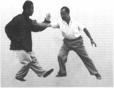 对方以右拳击我前胸,我即向后撤步退身,并以左掌拦阻其右臂使之不 得前进,右手握拳置于右肋旁,准备发招(图483)。