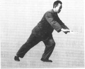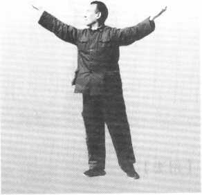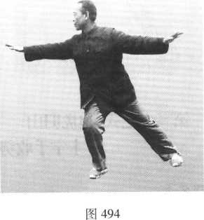 右掌以食指尖引导,向右移动到正南方时,右脚以脚尖为轴,脚跟虚起 向左移,脚尖向南,脚跟向北;右掌再向右移动到正西方,左脚跟向左移, 脚尖向南;当右掌向右前方移动时,左掌向左展开,两掌掌心向下,两臂均 与肩平;重心集于右脚;视线注于右掌食指尖;意在右掌掌心(图494)。