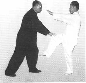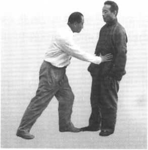 如对方仍以双掌向我推来,我则以两掌向左右分开,复向前推其胸,或 向下沉按其胸。使对方应手倒退出很远(图493 )□