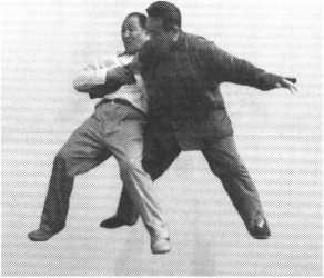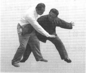 对方以左拳向我胸部打来,我则以左拳粘其左手腕,略微向左一带;同 时向左转身,进右步锁住对方之后腿,再将右掌展开靠近对方胸腹部,两掌 掌心均向下(图495、图496、图497 )□