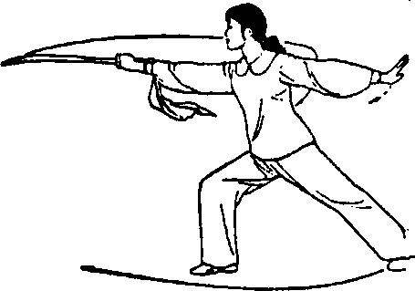 ②上动不停,右手持刀使刀尖沿地面和左腿向前上挑刀 探刺。同时身体重心前移至左腿,上体抬起。左腿随即屈膝 前弓成左弓步,右膝伸直。眼视前方。(图25 - 2)